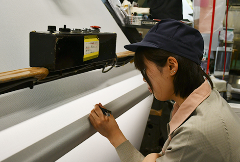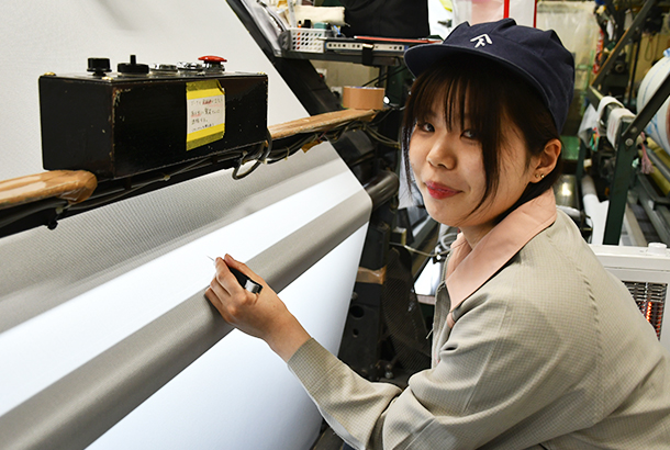 検反です。欠点の補修など細かな作業をしています。製品の最終検査を行う工程で、撚糸・製織された反物の欠点の見逃しがないように検査・修正する作業をしています。